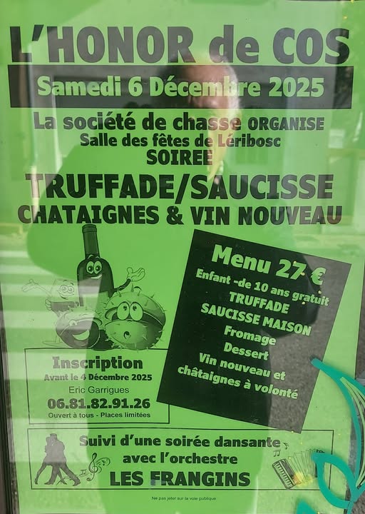 Les chasseurs de l'Honor de Cos vous invitent à partager la truffade du samedi 6 décembre 2025 à la salle des fêtes de Léribosc. Chataîgnes et vin nouveau seront de la fête. Pensez à réserver au 06 81...