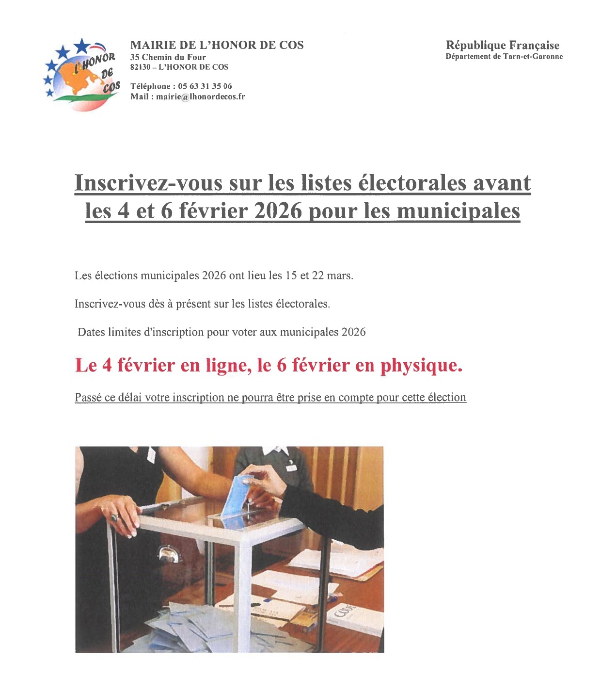 Pensez à vous faire inscrire sur les listes électorales .Dates limites : le 4 février en ligne et le 6 février en mairie.