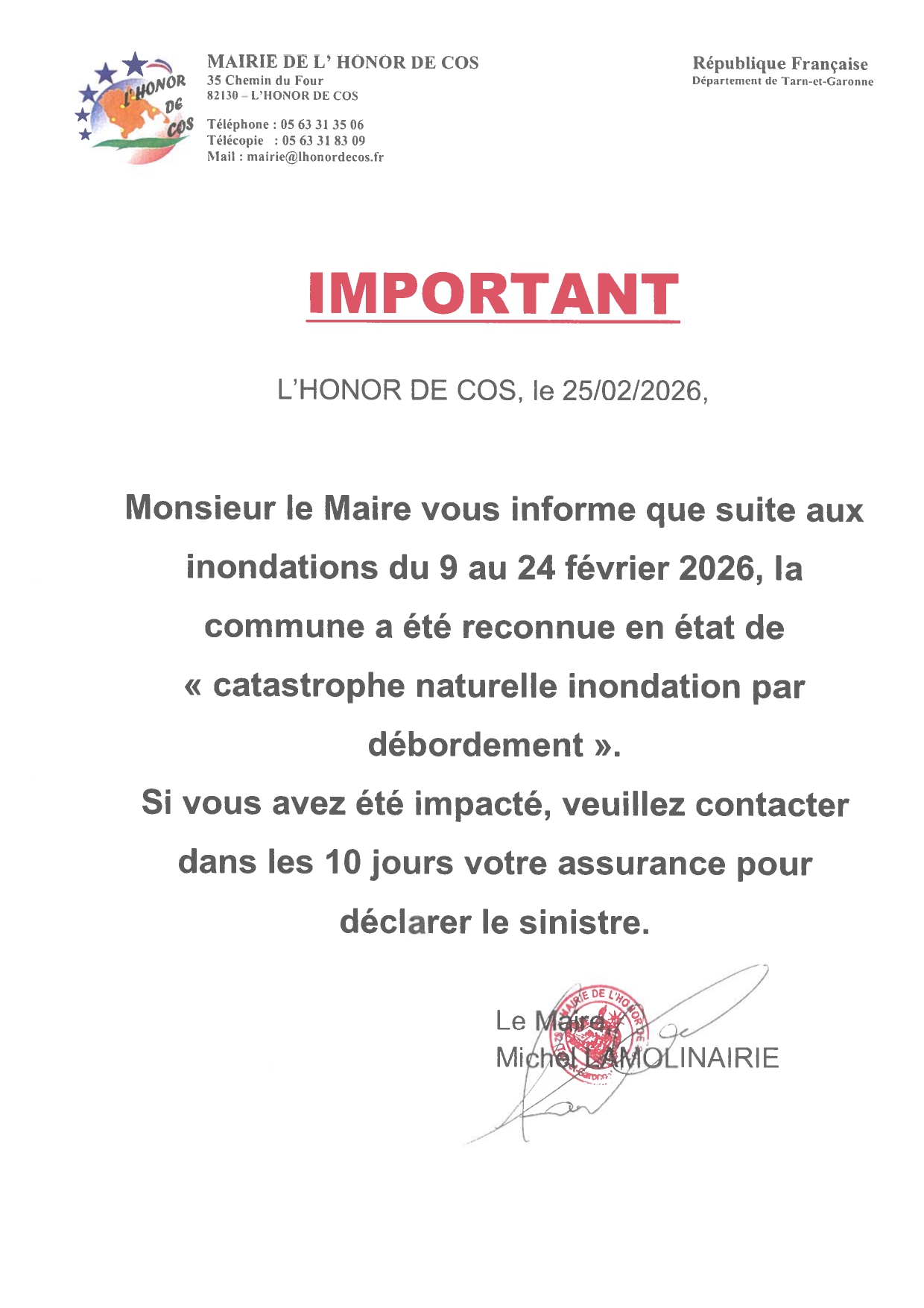 IMPORTANT : Monsieur le maire vous informe que suite aux inondations du 9 au 24 février 2026, la commune a été reconnue en état de catastrophe naturelle "inondation par débordement".