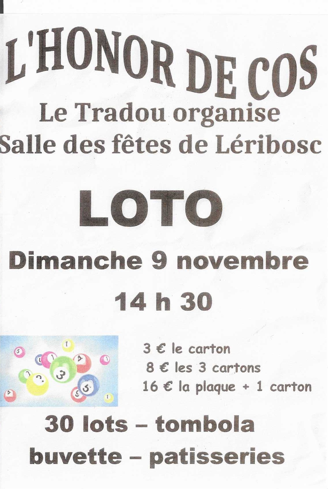 Grand loto du Tradou dimanche 9 novembre à 14h30 à la salle des fêtes de Léribosc