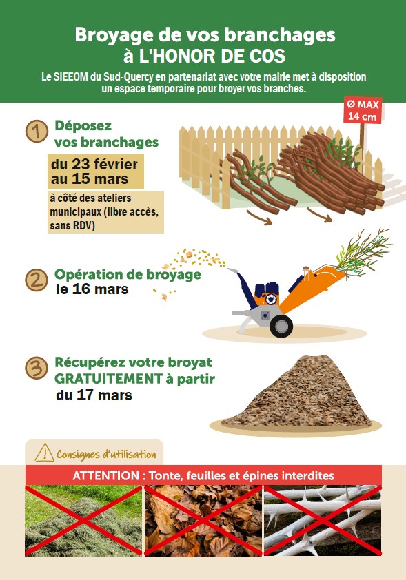 Organisée par le SIEEOM Sud Quercy, une opération de broyage des déchets verts se déroulera du 23 février au 17 mars devant les garages de la mairie à Léribosc. Pour les détails de l'opération voir le flyer ci-contre.